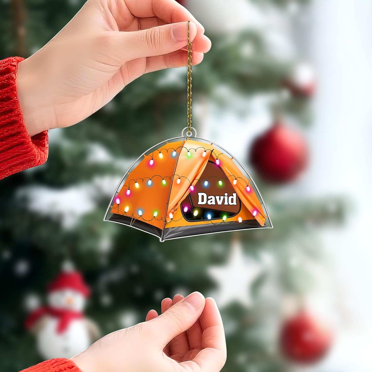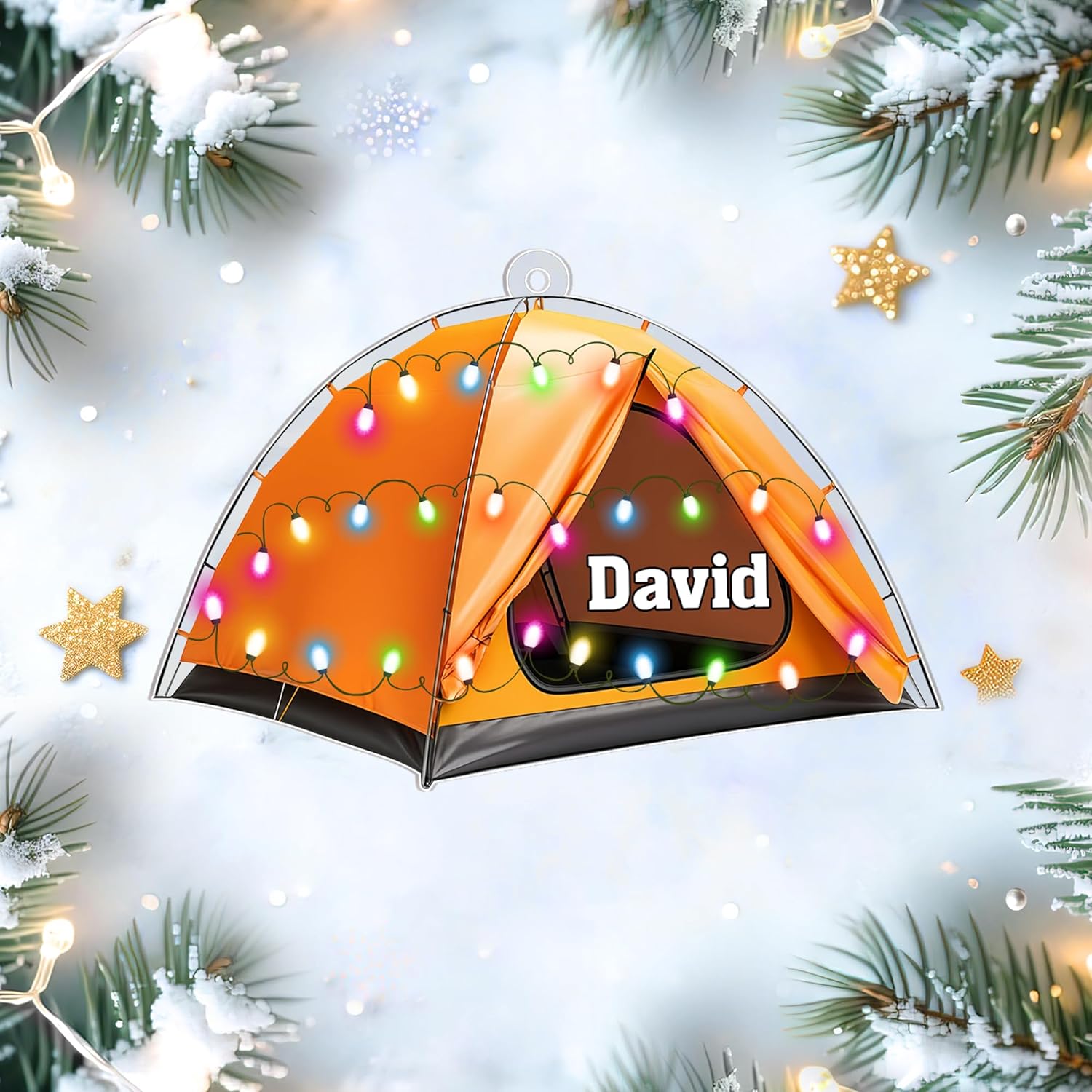 This camping tent ornament celebrates the magic of adventure and the beauty of nature ⛺✨. Its glowing orange tent design with festive lights evokes the cozy joy of nights under the stars. Crafted from premium acrylic, it is lightweight, durable, and printed in vivid full color for a shiny and vibrant effect that lasts through the years. 🎄 Perfect for hanging on your tree or decorating your travel van, it reflects your love for the outdoors. The ornament captures freedom, friendship, and joyful escapes into nature. Every personalized name makes it a meaningful keepsake for campers and explorers alike. 💝 A charming addition for travel lovers who collect memories wherever they go. Its detailed finish keeps it sparkling bright each season. The smooth edges and clear shape bring a modern, elegant touch to rustic décor. Let it remind you of starry nights and warm campfires. This ornament glows beautifully with every reflection of light. It’s the perfect mix of adventure and warmth in one keepsake. ✨ Add this wanderlust treasure to your cart and keep your camping memories alive each Christmas!