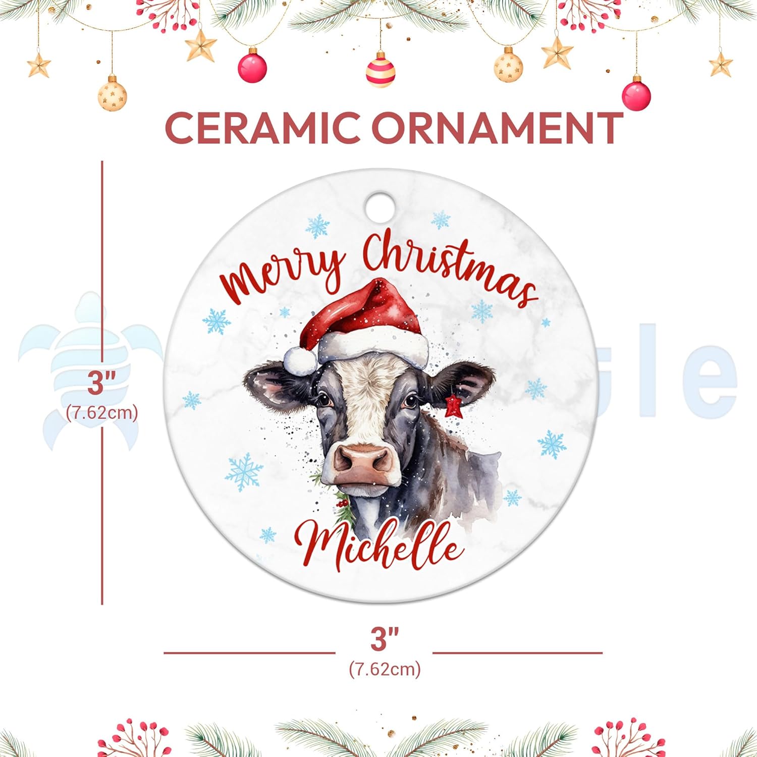 MESSAGE: Add rustic cheer to your tree with a personalized cow ornament, bringing festive farmyard charm to your holiday décor.
