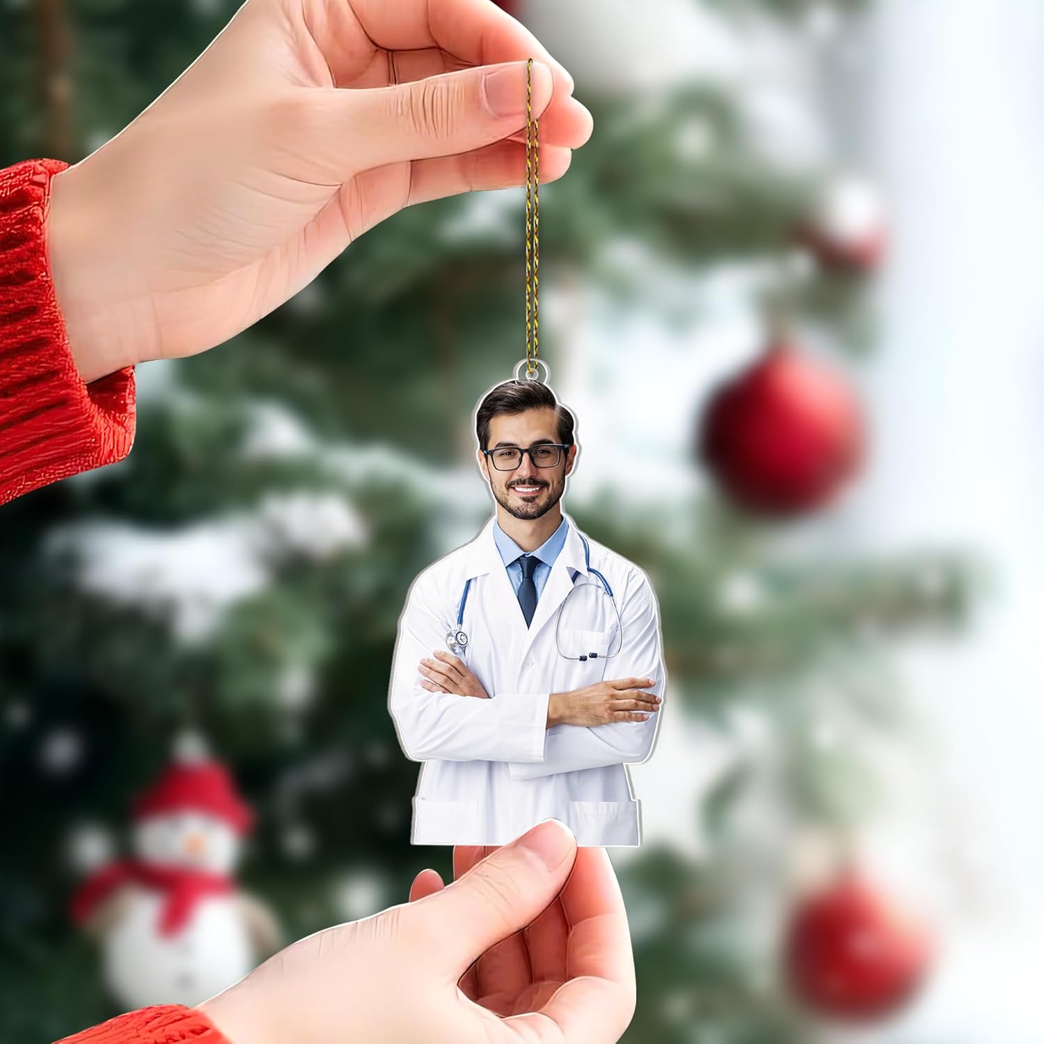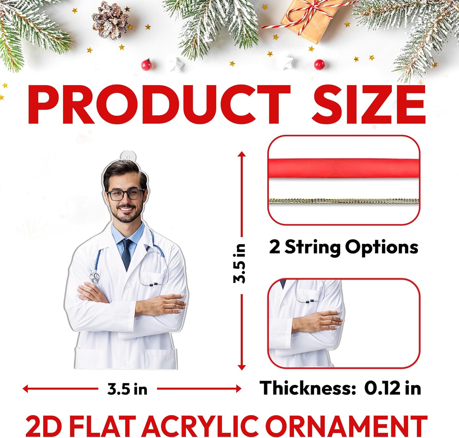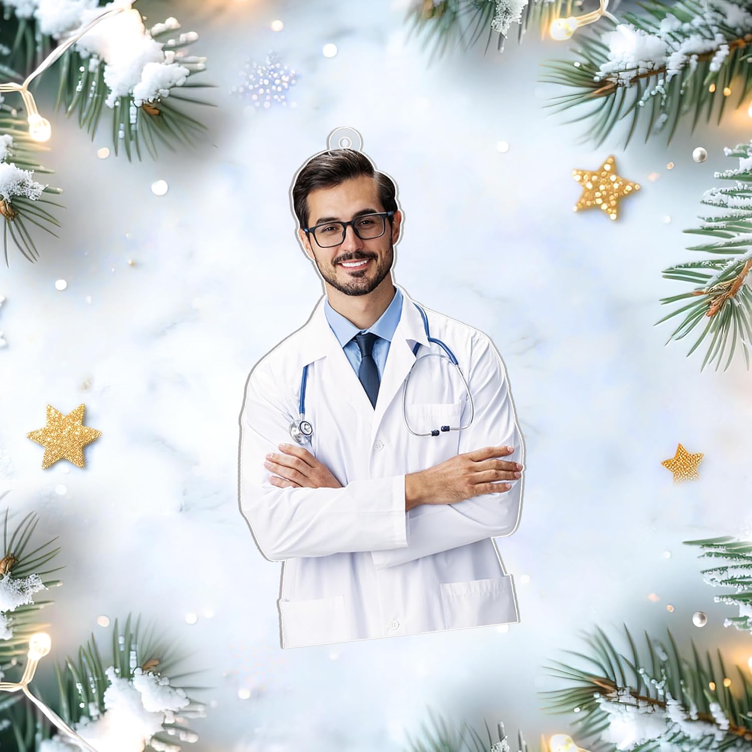 A confident doctor in a white coat stands ready, stethoscope at the shoulders and arms folded. The clean silhouette pops against greenery, honoring skill, study, and service. It brings clinic pride to holiday décor with a professional touch. Premium acrylic keeps the piece light but sturdy for long seasons. Full-color UV print preserves lifelike details and edge clarity. A polished surface gleams under string lights and office lamps. Double-sided silhouette and gold cord ensure eye-catching display anywhere. Ideal for doctors, PAs, med students, and residency grads. Hang it on the hospital tree, office door, or home study. It celebrates dedication through night shifts, rounds, and patient stories. Give it for Match Day, graduation, promotion, or appreciation week. Personalize with name, credentials, or year for a cherished memento. Scratch-resistant, fade-proof construction protects your message. Its modern style pairs well with scrub-color themes and minimal décor. Personalize yours today and make this season memorable.