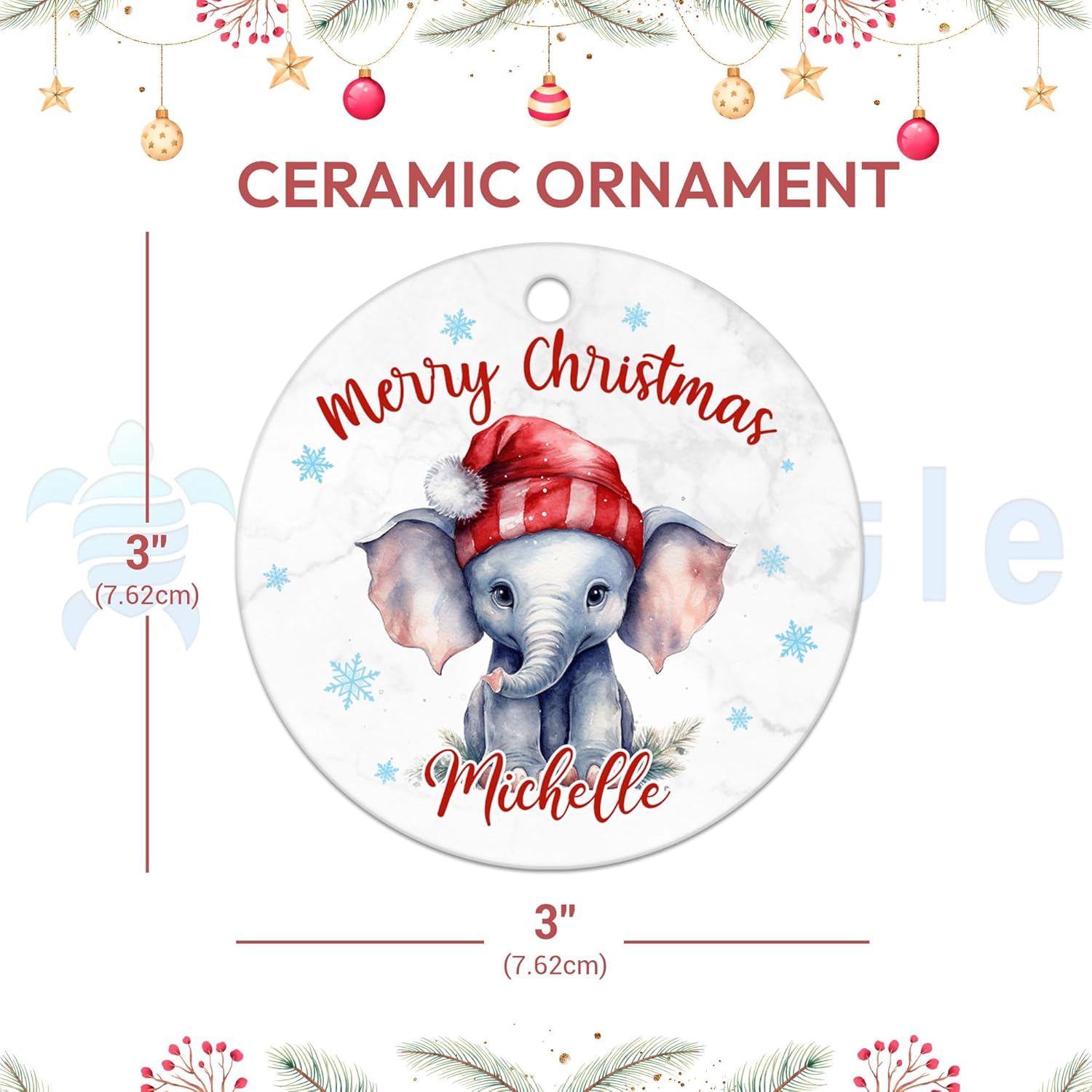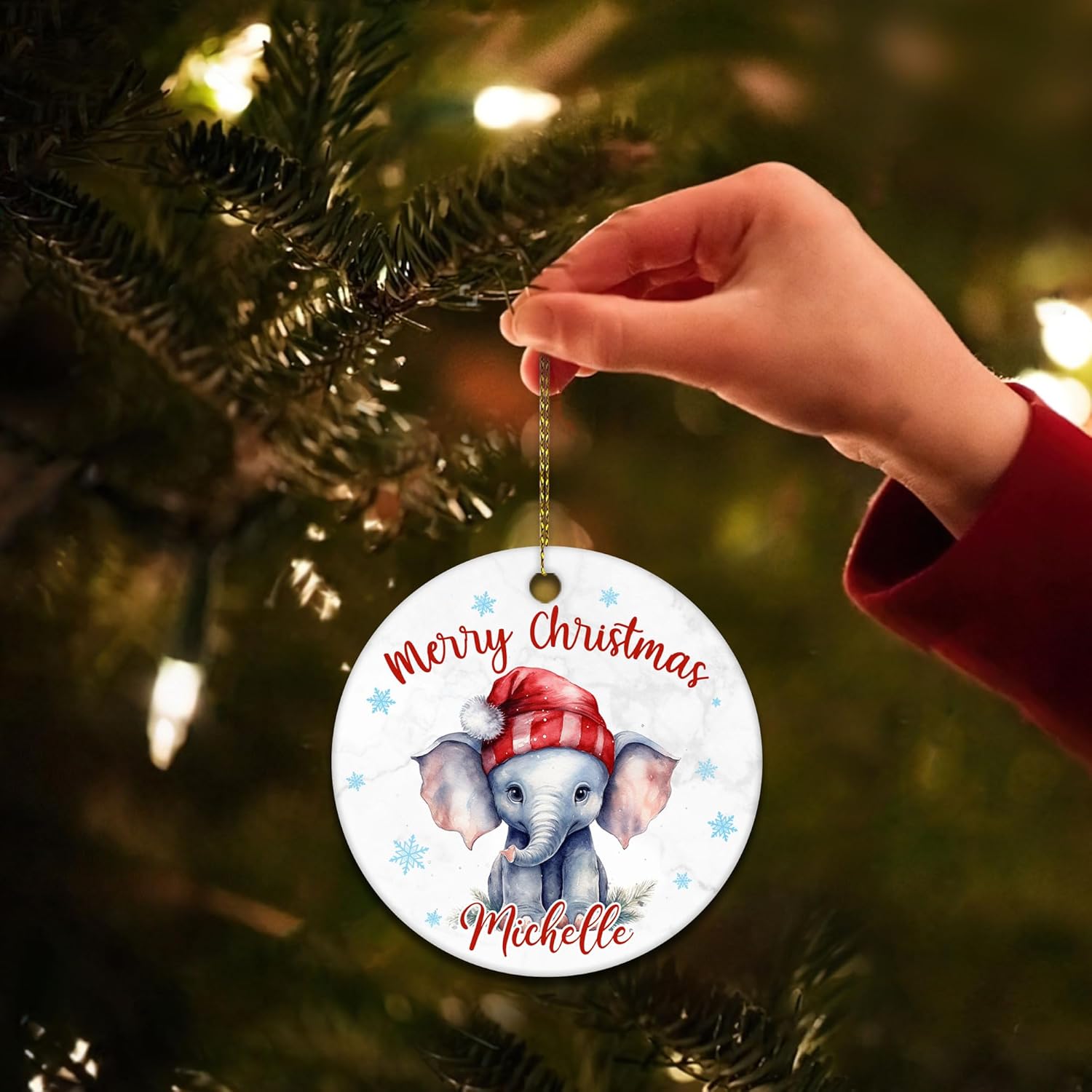 This ornament highlights a playful elephant in a Santa hat, a whimsical design that delights both children and adults. Its adorable illustration brings the charm of wildlife into your Christmas décor. Crafted from sturdy ceramic, it features full-color printing on both sides for bright and lasting detail. The crisp and vivid design looks lively when illuminated by holiday lights. Lightweight construction ensures it hangs easily on any tree. A golden cord is included, making it ready for immediate decorating. Beyond durability, it creates a sense of warmth and joy, blending festive tradition with love for animals. A meaningful gift for elephant lovers, families, or kids who enjoy safari animals. Ideal for Christmas exchanges, birthdays, or keepsakes. Personalized with a name, it becomes a unique and sentimental treasure. Each holiday season, it will spark smiles and memories of thoughtful gifting. Make your tree extra special with this elephant ornament.