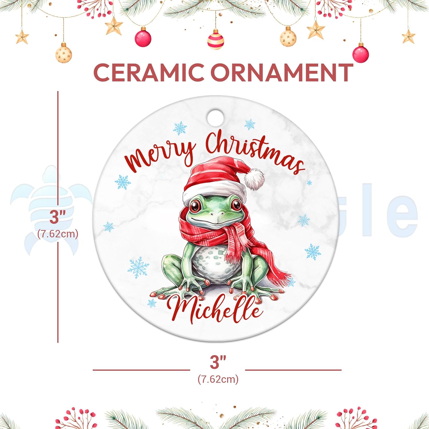 This ceramic ornament captures the charm of a festive frog wearing a Santa hat and scarf, surrounded by snowflakes for a whimsical seasonal look. Printed on both sides in full color, the design stands out with a bright and lively finish that remains fresh year after year. At 3x3 inches, it’s sized perfectly for tree branches, garlands, or festive displays. Made from high-quality ceramic, it’s lightweight yet durable, resisting fading and damage across many holiday seasons. Its polished surface highlights crisp detailing, and the included gold cord ensures easy hanging. Beyond technical features, it adds fun and humor to Christmas celebrations, sparking conversations and smiles. This frog ornament is ideal for kids, women, and families who enjoy quirky animal designs. It works beautifully as a Christmas gift, stocking stuffer, or whimsical keepsake for birthdays around the holiday season. Personalization with a name makes it even more special, ensuring it holds sentimental meaning for years. Add it to your decorations today to enjoy a blend of fun, quality, and personalization.