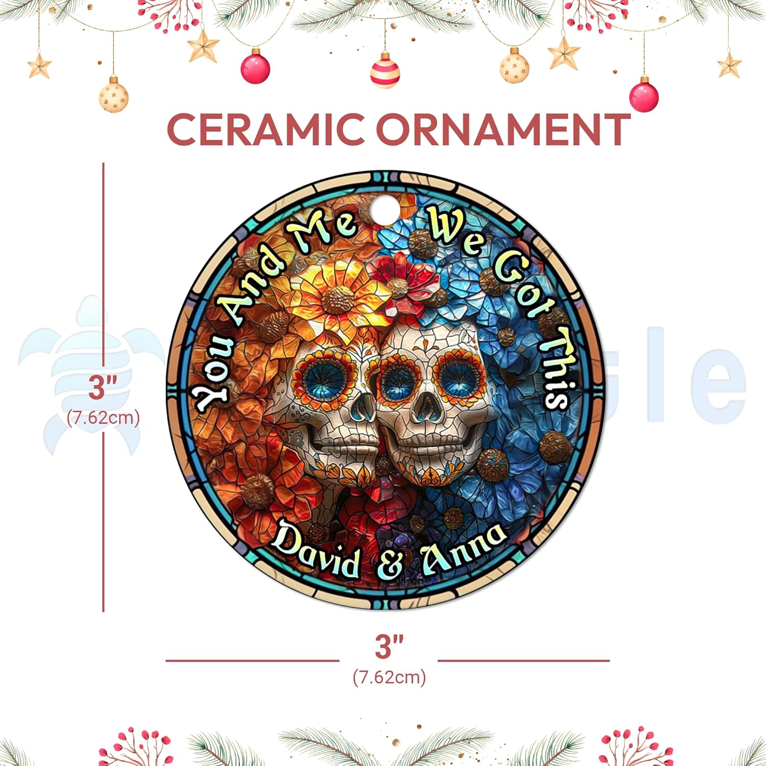 The design showcases a striking pair of skulls surrounded by vivid floral mosaics, symbolizing eternal love and unity. With bold Gothic style and vibrant colors, it stands out as both decorative and meaningful. Crafted from sturdy ceramic, it offers a radiant finish and lasting durability. The double-sided full-color printing ensures every detail is sharp and lively. Its lightweight structure and secure gold cord make hanging effortless. A wonderful decoration not only for Christmas trees but also for anniversary displays or wedding keepsakes. This ornament is perfect for couples who embrace Gothic, bohemian, or alternative styles. Celebrate love that lasts through all seasons with this striking art piece. A personalized touch makes it more intimate, turning it into a cherished memento. Ideal for anniversaries, weddings, engagements, or simply to honor a relationship milestone. Beyond décor, it serves as a symbol of partnership and strength. Add this meaningful keepsake to your collection and surprise your loved one.
