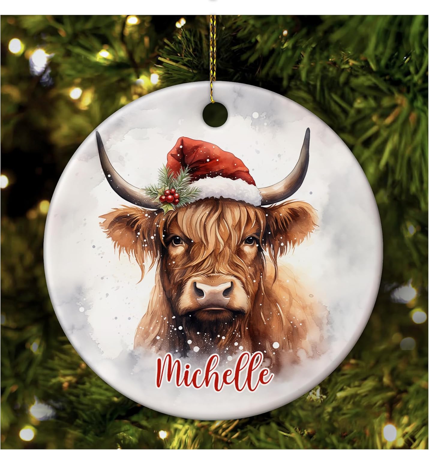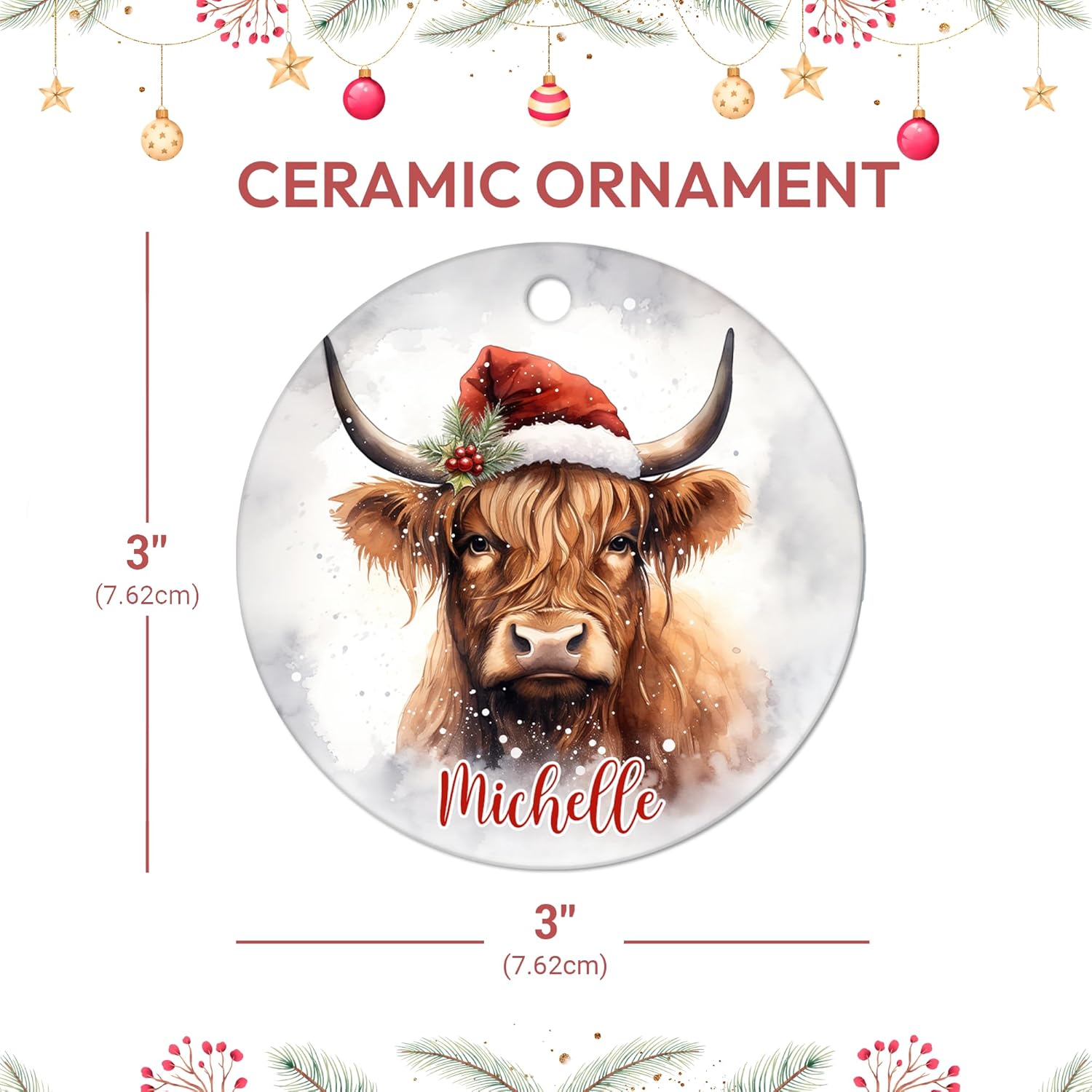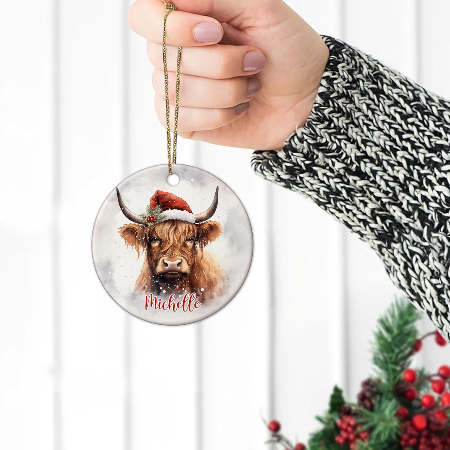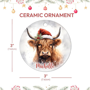 Highland Cow Christmas Ceramic Ornament – Personalized Double-Sided Glossy Tree Decoration – Keepsake Gift for Highland Cow Lovers
