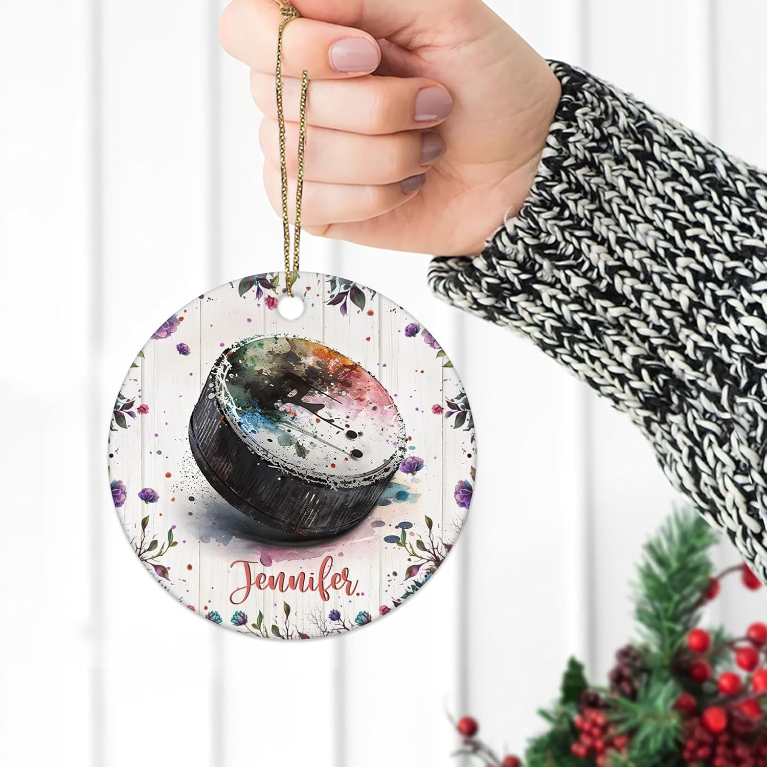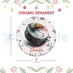 Featuring a bold hockey puck design surrounded by floral accents, this ornament blends the love of sport with holiday tradition. The detailed artwork captures the excitement of the game, making it an ideal décor piece for hockey fans. Made from high-quality ceramic, it showcases vibrant prints on both sides, ensuring long-lasting clarity and beauty. The polished surface highlights crisp detailing, while its lightweight structure allows easy hanging anywhere. A sturdy gold cord ensures secure placement on your Christmas tree. Beyond technical durability, it provides a personalized charm that transforms ordinary décor into a meaningful keepsake. Perfect for decorating sports-themed trees or adding personality to a coach’s office holiday display. It evokes team spirit and memories of the rink, uniting family and friends in seasonal joy. A sentimental gift for players, coaches, or hockey-loving girls. Ideal for Christmas, birthdays, or special sports milestones. With custom name printing, it becomes a treasured reminder of passion for the game. Each holiday season, it will spark fond memories of victories and teamwork. Order today to score big with a unique hockey ornament.