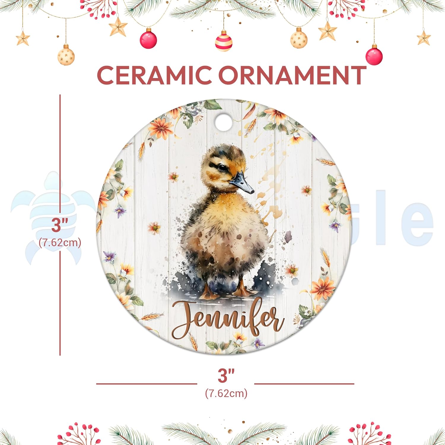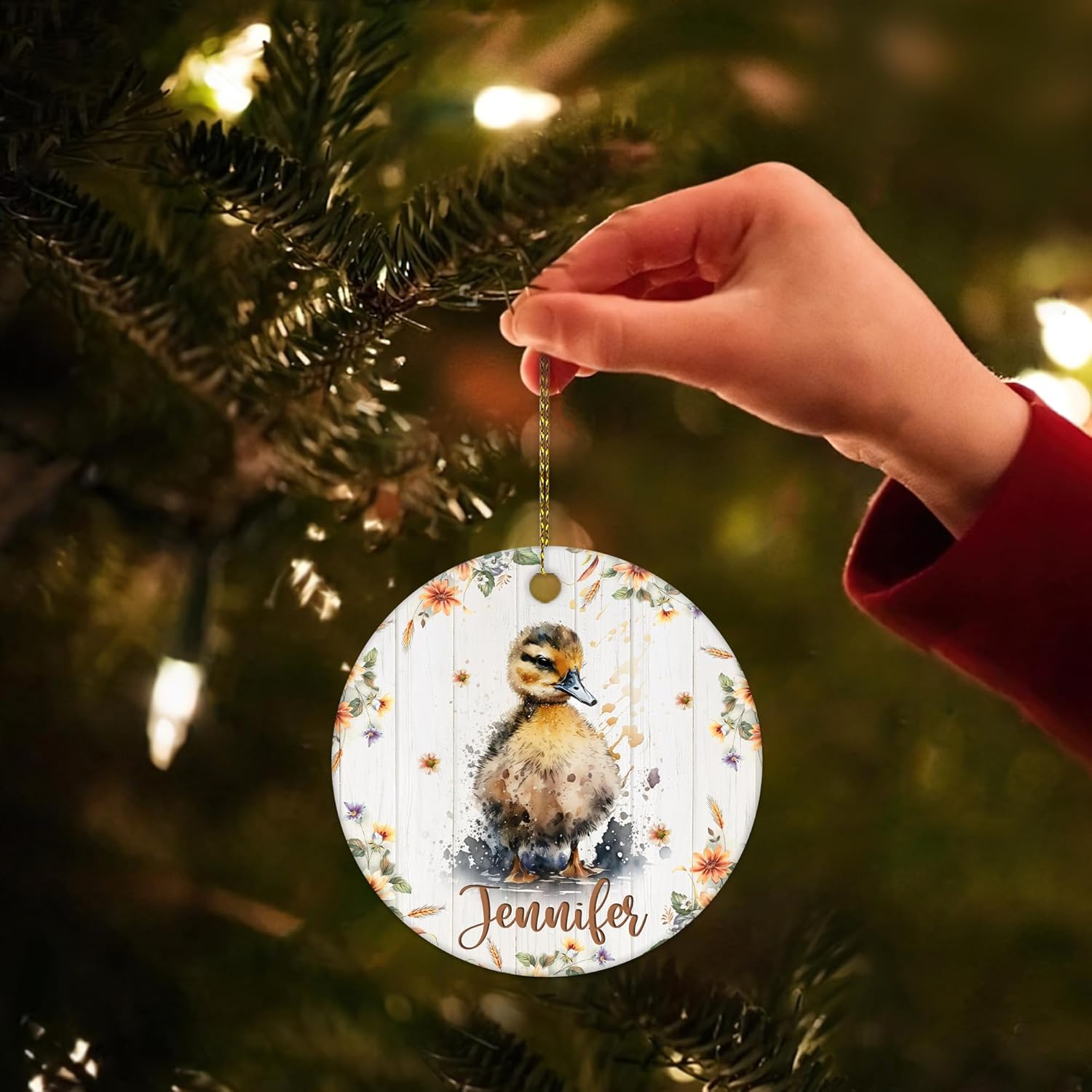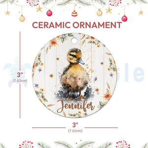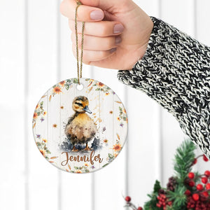 MESSAGE: Gentle duckling art, shiny ceramic, personalized tree decoration—sweet country charm for holiday gifting.