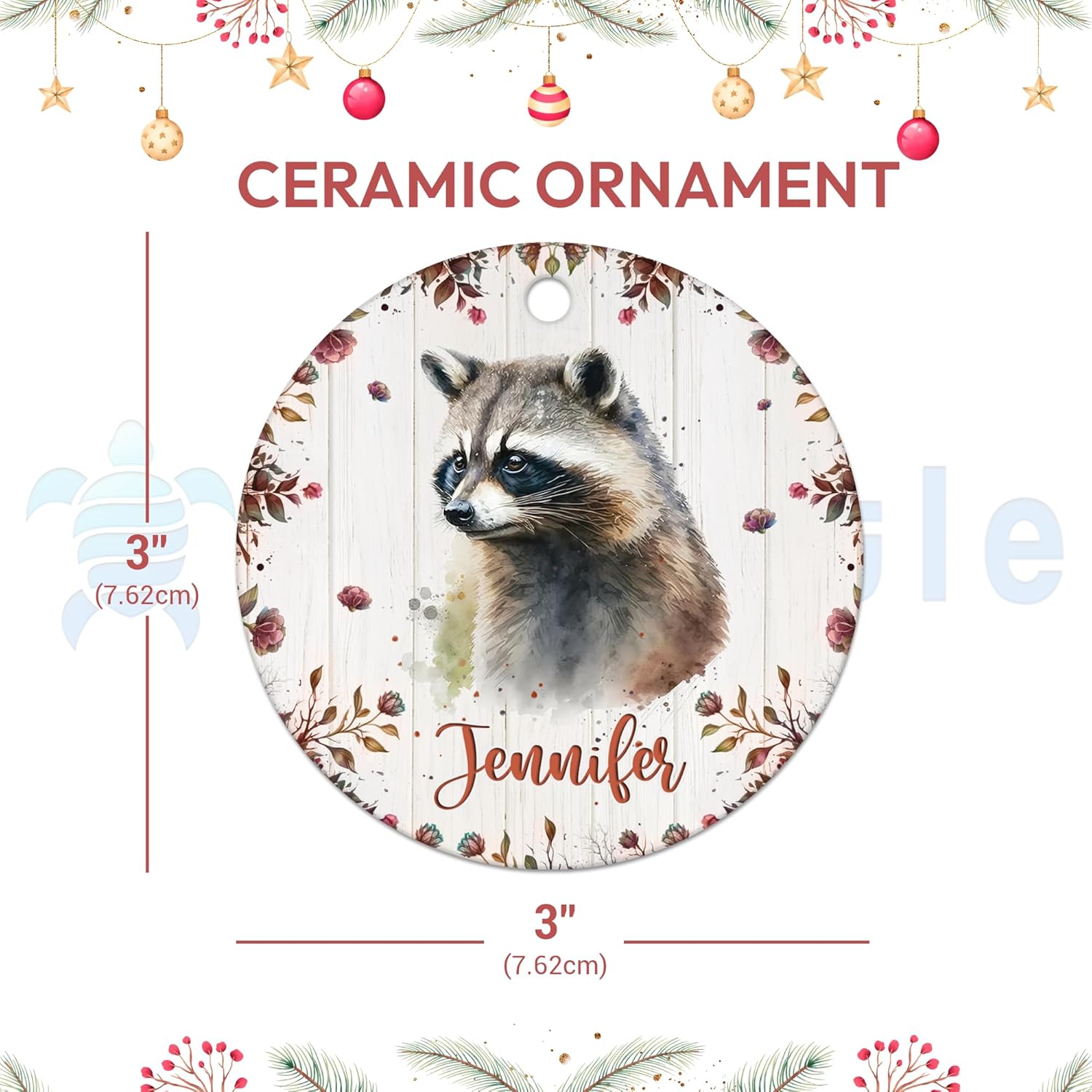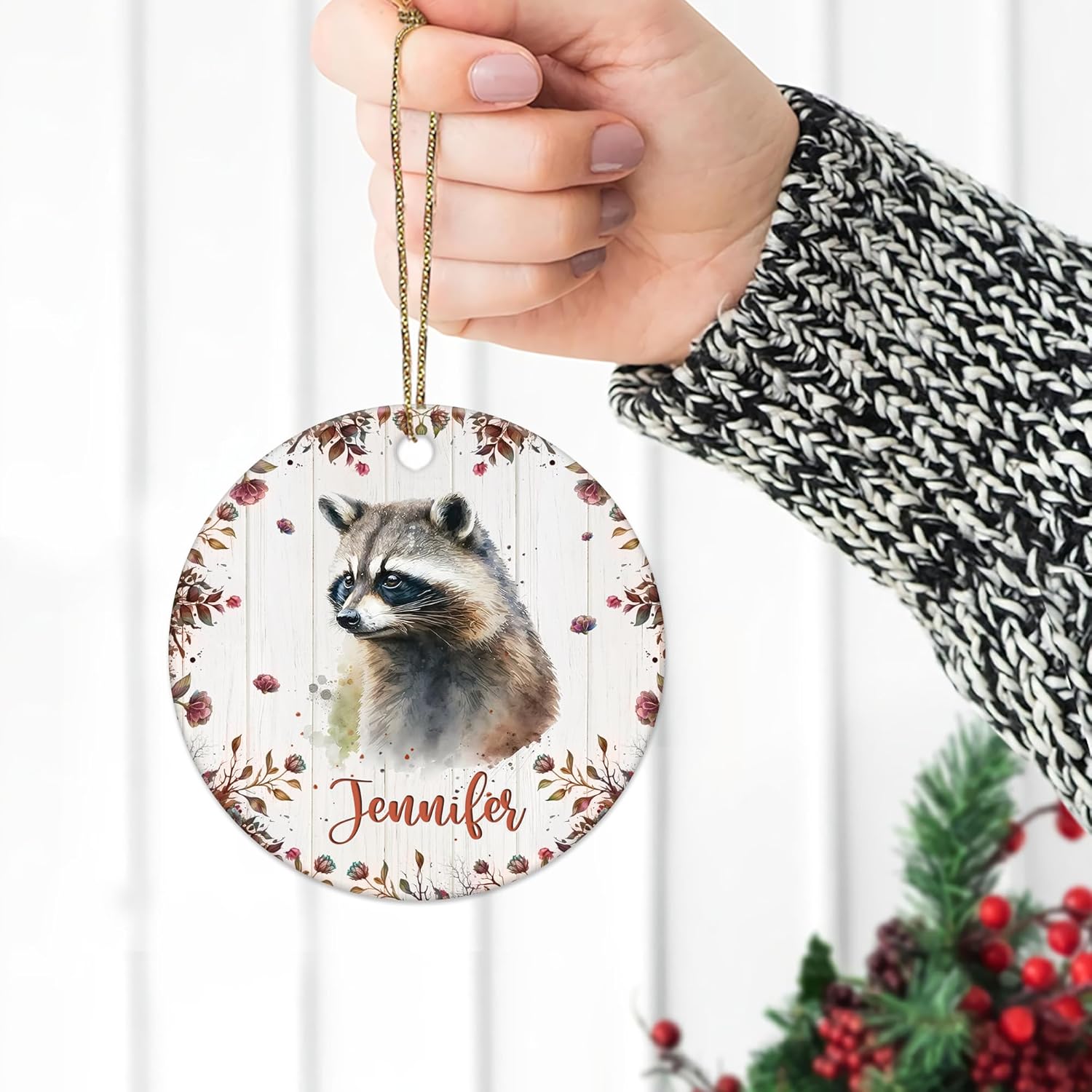 MESSAGE: Add woodland charm with a personalized raccoon ornament – festive keepsake for cozy Christmas décor and animal lover joy.