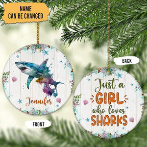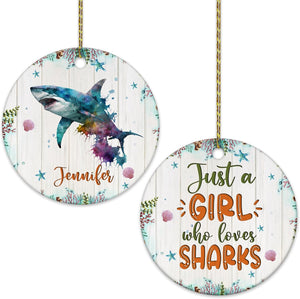 This ceramic ornament brings the thrill of the ocean to your Christmas tree with a bold shark design accented by a vibrant watercolor splash. The “Just A Girl Who Loves Sharks” text adds a fun and playful theme, making it a standout piece for marine life enthusiasts. Its double-sided full-color printing ensures every detail is captured with a crisp and radiant finish that remains vibrant for years. Crafted from premium ceramic, this ornament measures 3x3 inches, the ideal size for trees, wreaths, or wall hangings. Its polished surface enhances the lifelike design, making it an elegant yet spirited seasonal accent. The included gold cord makes hanging simple, so it’s ready to decorate immediately. Lightweight yet durable, it resists fading, scratches, and wear from year to year. This ornament fits seamlessly with coastal, nautical, or beach-themed holiday décor, adding a unique twist to the usual Christmas look. It is more than just a decoration; it’s a keepsake that expresses love for the ocean and its creatures. Perfect as a Christmas present for women and girls who adore sharks, it also works as a fun birthday gift for marine lovers. Personalized with a name, it becomes a cherished keepsake that carries sentimental value. Whether gifted to family, friends, or co-workers, this shark ornament spreads cheer and sparks conversations. Add it to your collection today for a holiday filled with ocean-inspired charm.