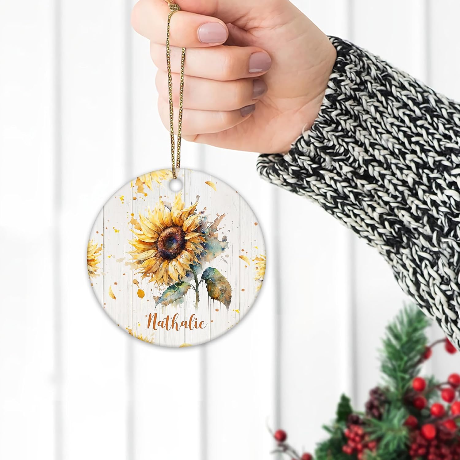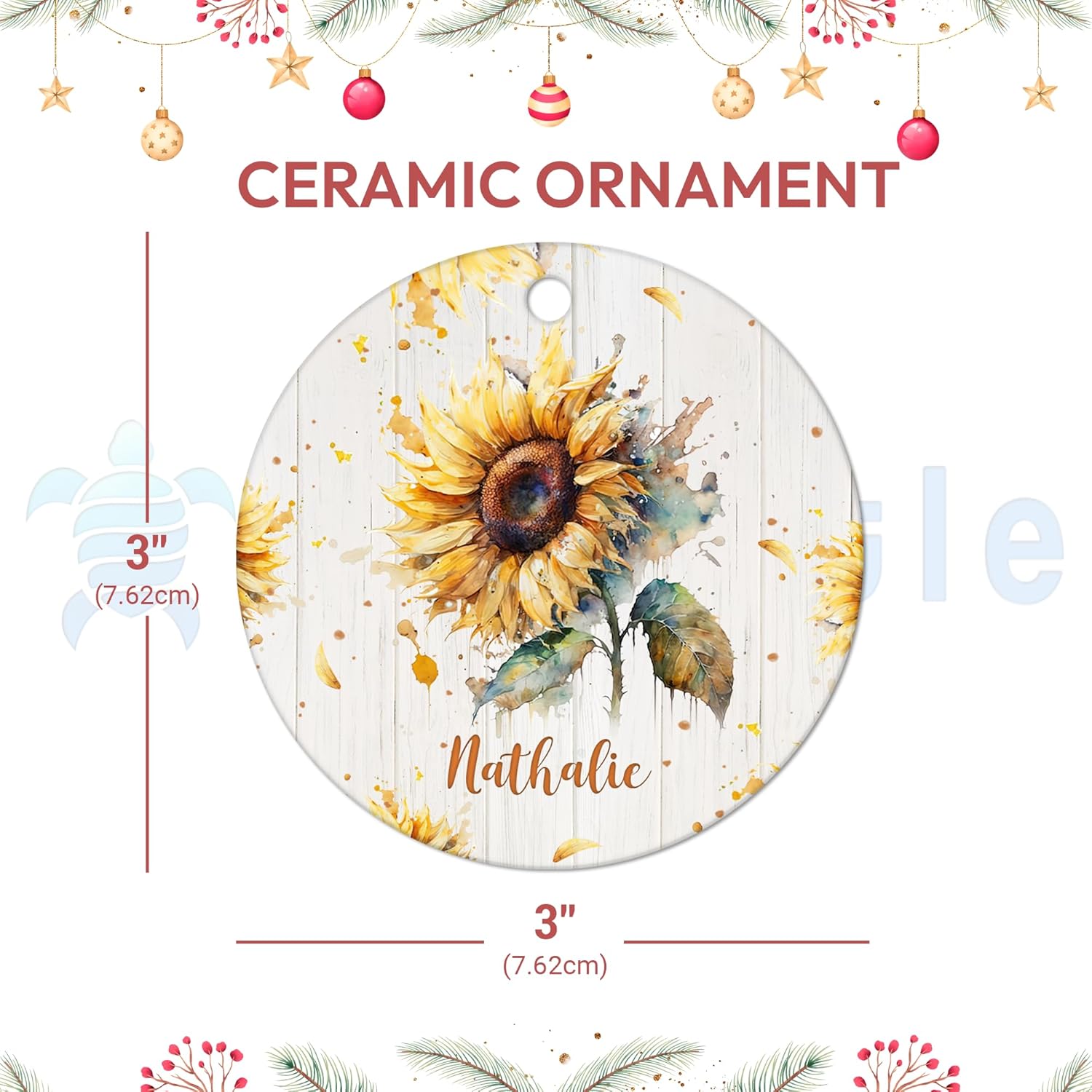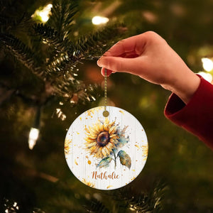 Brighten your tree with this radiant sunflower design that celebrates positivity and warmth. Its cheerful petals stand out beautifully against the background. Made from premium ceramic, this ornament measures 3 x 3 inches and showcases a brilliant surface that highlights detail and color. Printed double-sided in vivid full color, the design lasts year after year. Lightweight and easy to hang with a gold cord, it suits Christmas trees, wreaths, or table centerpieces. Beyond technical features, it adds storytelling charm by bringing summer brightness into winter festivities. A perfect gift for floral lovers, family, or friends. Great for Christmas, housewarmings, or birthdays. Personalized with a name, it transforms into a keepsake that holds memories. Order today and let your holidays bloom with sunflower beauty.
