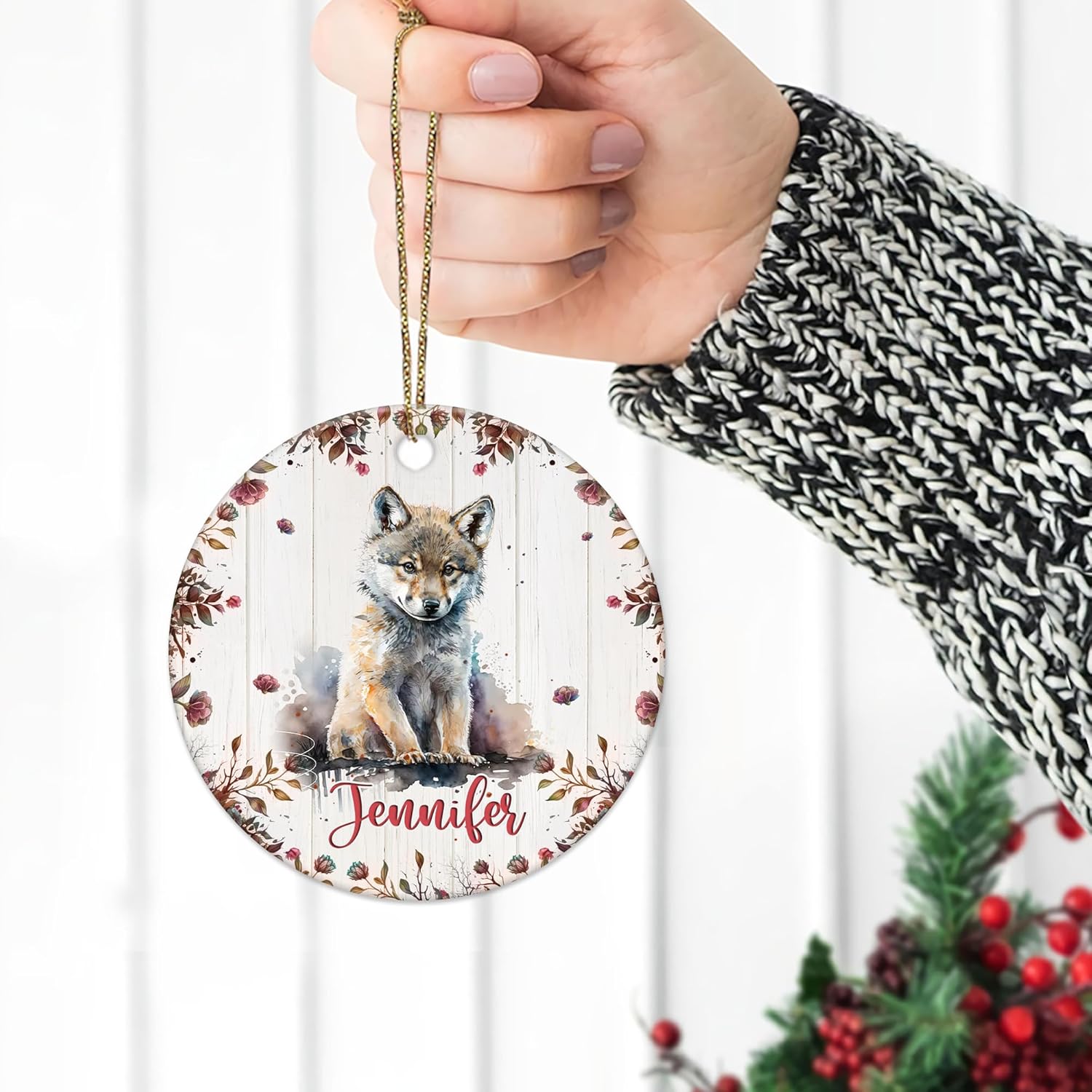 The fierce beauty of wolves comes alive in this artistic ceramic ornament, perfect for Christmas celebrations. The design features a noble wolf surrounded by floral patterns, creating a striking balance of wild and festive. Made from strong ceramic, it delivers a vivid finish that enhances every brushstroke of the artwork. Double-sided printing ensures the design stands out on both sides, catching eyes from across the room. Its durable yet lightweight build makes it perfect for holiday decorating. This ornament suits those who admire wildlife and enjoy rustic, woodland-inspired holiday themes. Beyond décor, it becomes a treasured keepsake for birthdays, Christmas, or even memorial gifting. Personalized with a name, it transforms into a truly unique reminder of love for wolves. Ideal for animal lovers and families who cherish outdoor beauty. Add it to your Christmas tree, or gift it to someone special who shares a passion for nature. Order today and make this piece part of your holiday tradition.
